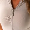 Modelagem que não possui costuras na parte frontal da peça. Na frente possui zíper com puxador personalizado, com fechamento até a gola com detalhe da manga raglan. Possuiu detalhe de termocolante ROSA IMPERIAL. Com forro na parte dos seios ele garante muita sustentação e extremo conforto.