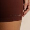 Costas fechadas com detalhe de costuras rebatidas no recorte empina bum bum.